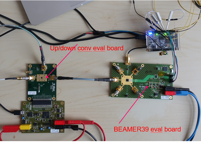 In particular, Infineon provided full evaluation boards for both the BEAMER39 IC as well as the respective evaluation board for its proprietary up/down conversion IC to be used as an interface between the RF front-end and the baseband processing module. The picture shows the two evaluation boards in a first test setup provided by TUB.